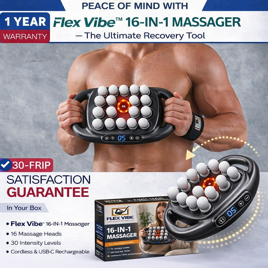 Experience powerful muscle relief with the Flex Vibe™ 16-In-1 Massager. Designed with 16 massage heads and 30 adjustable intensity levels, it targets deep muscle tension, boosts circulation, and helps your body recover faster after workouts or long days.