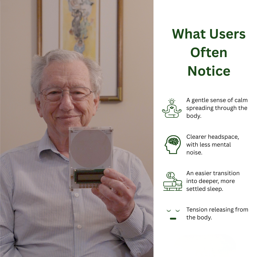 Our device emits natural sine wave frequencies — subtle, body-safe signals that support your nervous system’s return to a regulated state.