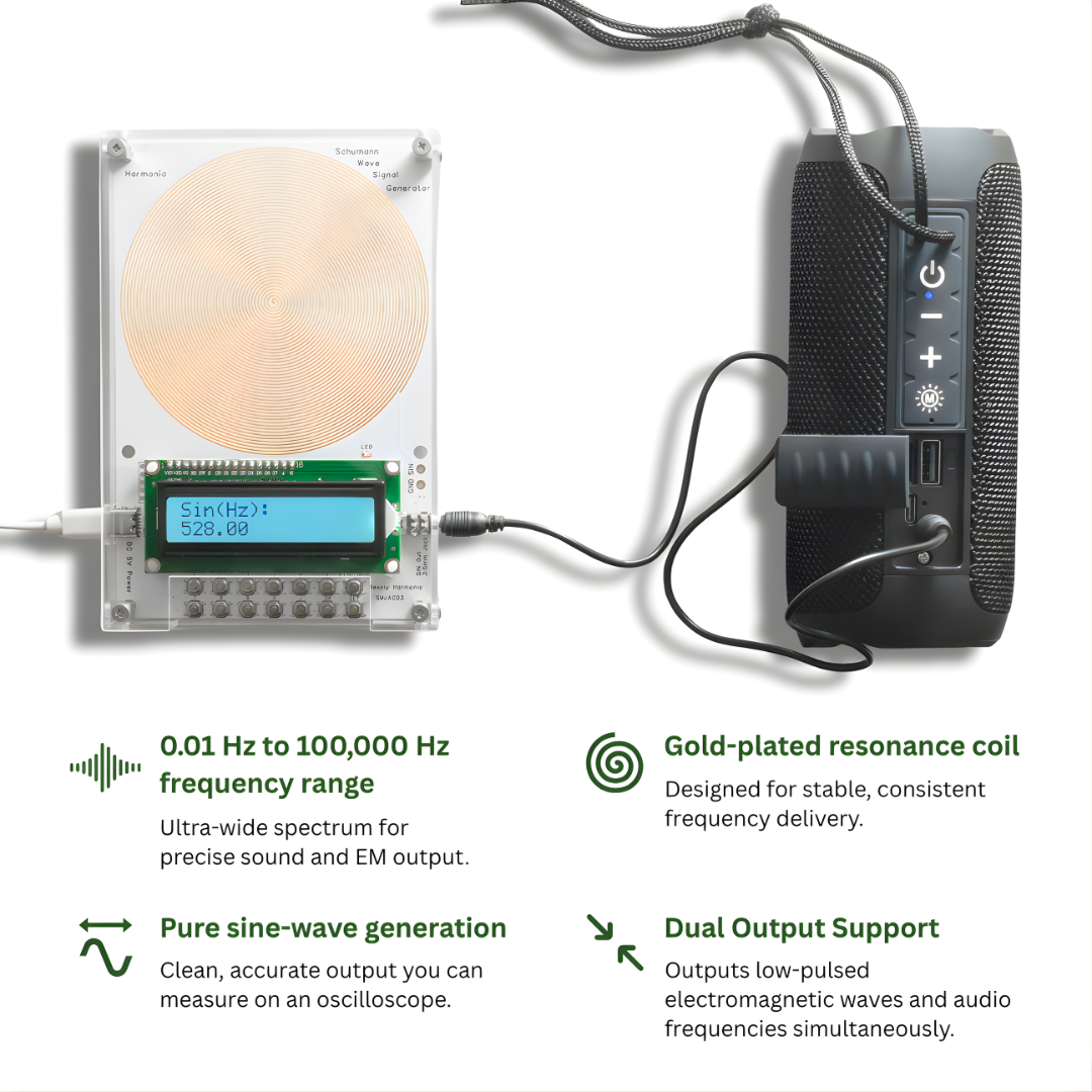 The device works by generating specific frequencies throughPulsed Electromagnetic Fields (PEMF)or sound (when connected to a speaker or headphones). To get started, we recommend purchasing thebundle, which includes everything you need: the device, a Bluetooth speaker, all necessary cables, and a case. No additional purchases are required for it to function.
